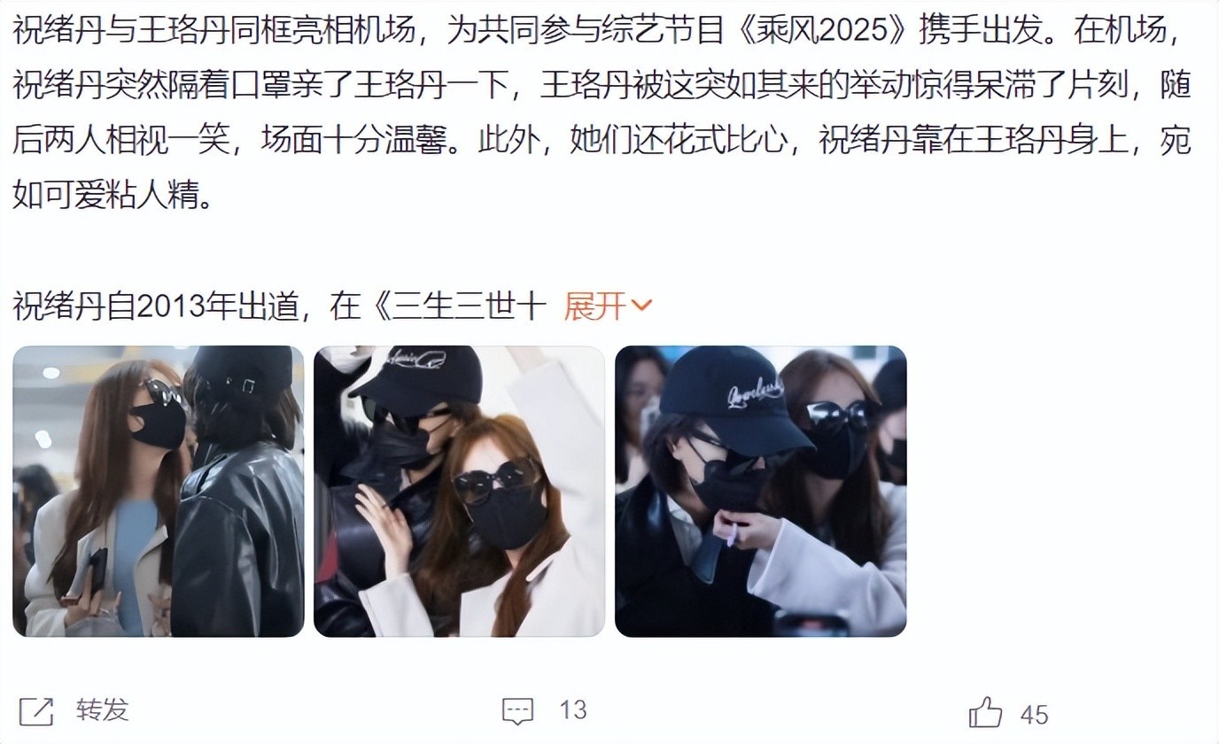 近日,“祝绪丹亲了王珞丹”话题登上热搜,为参与录制《浪姐6》,祝绪丹和王珞丹一起出发,在机场的时候,祝绪丹突然隔着口罩亲王珞丹一下,面对祝绪丹突如其来的举动,愣了一下,然后两人相视一笑,场面非常温馨,面对来接机的粉丝,祝绪丹和王珞丹还花式比心,看到这一幕,许多网友都表示磕到了。